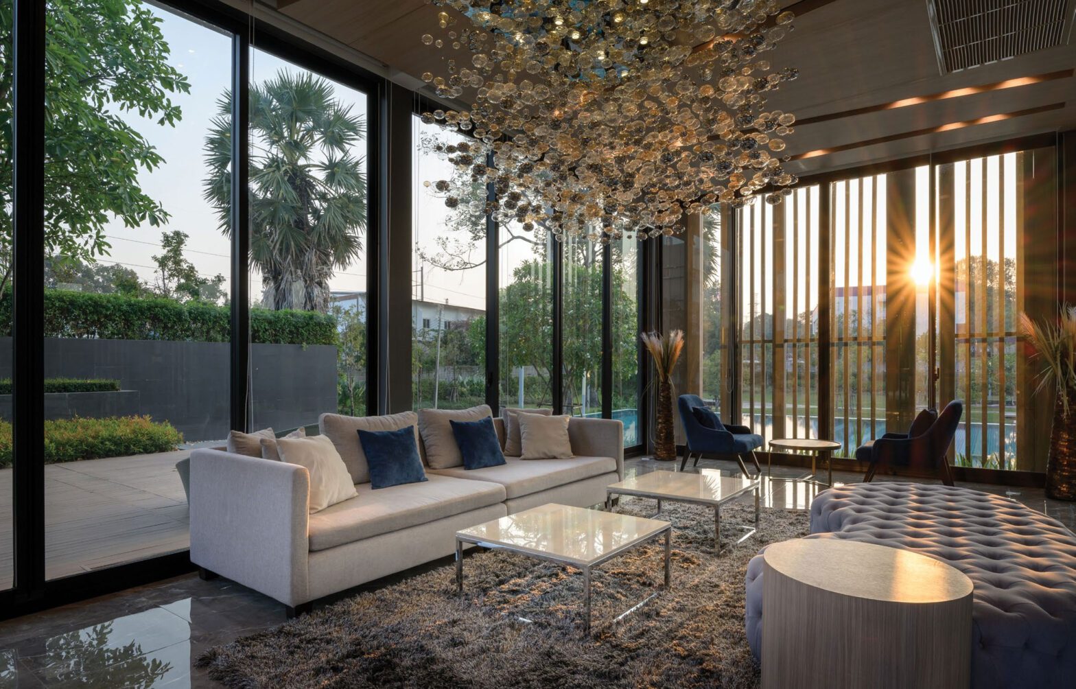 - Ambient Lighting: Soft, indirect cove lighting hidden in a custom false ceiling to cast a warm glow across the room.